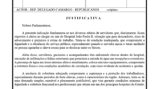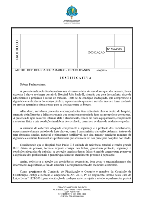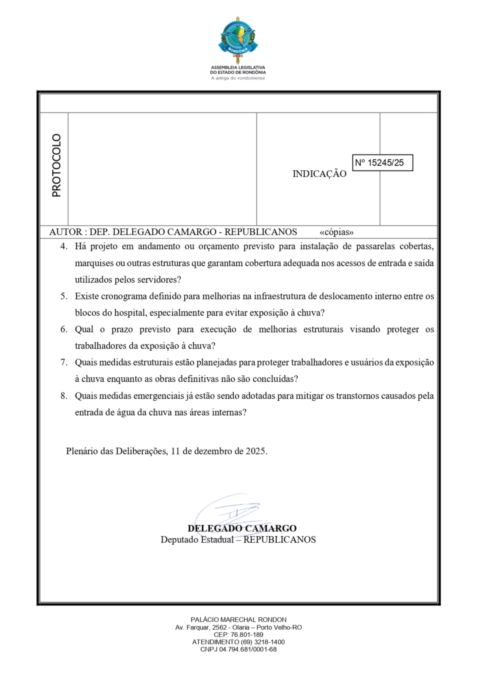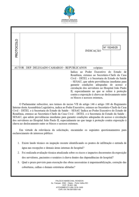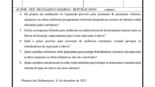 O congressista também demanda esclarecimentos técnicos sobre a existência de relatórios de inspeção, prazos para obras de impermeabilização, reparos em telhados e calhas, bem como a instalação de passarelas cobertas, copas, ou outras estruturas que garantam proteção adequada nas áreas de acesso utilizadas pelos colaboradores. Além disso, ele questiona quais medidas de emergência estão sendo adotadas, enquanto soluções definitivas não são implementadas.