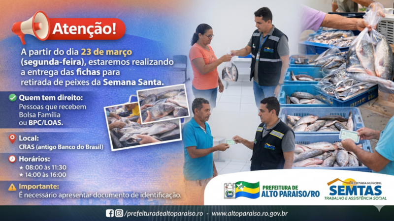 A Prefeitura, através da SEMTAS, informa que a partir do dia 23 de março (segunda-feira) dará início à entrega das fichas para a retirada de peixes da Semana Santa.