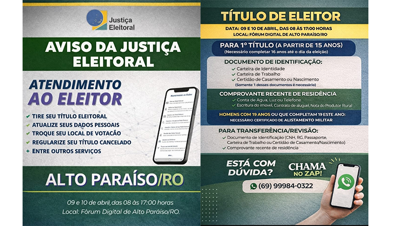 A Justiça Eleitoral estará na nossa cidade para um mutirão de atendimento ao eleitor. É a sua chance de resolver qualquer pendência e garantir o seu direito ao voto! ️ Ficou com alguma dúvida? O pessoal da Justiça Eleitoral atende pelo WhatsApp: (69) 99984-0322.